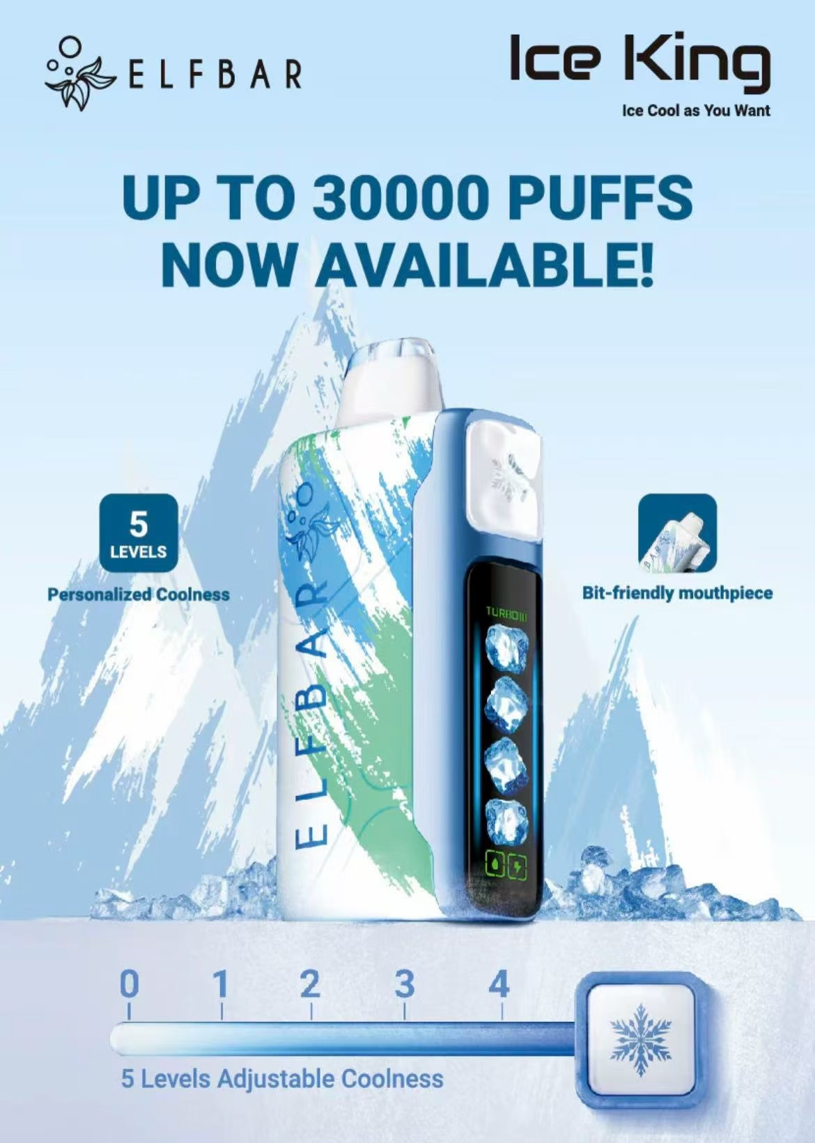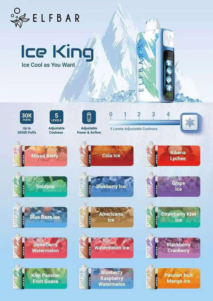 参数项 详细信息 产品名称 ELFBAR Ice King Disposable Vape 核心卖点 5档可调冰凉度 (5 Levels Adjustable Coolness) 口数 高达 30000 Puffs (30K) 可调功能 功率与气流可调 (Adjustable Power & Airflow) 冰凉档位 0-4 共 5 级冰凉调节 品牌 ELFBAR 产品类型 一次性电子烟 (Disposable Vape)